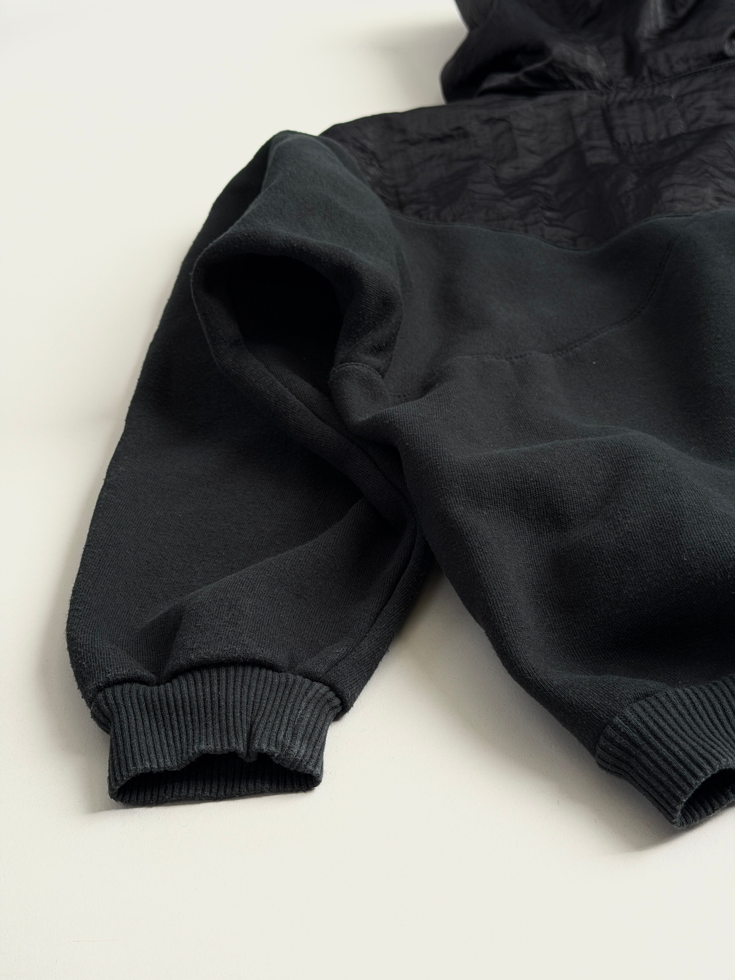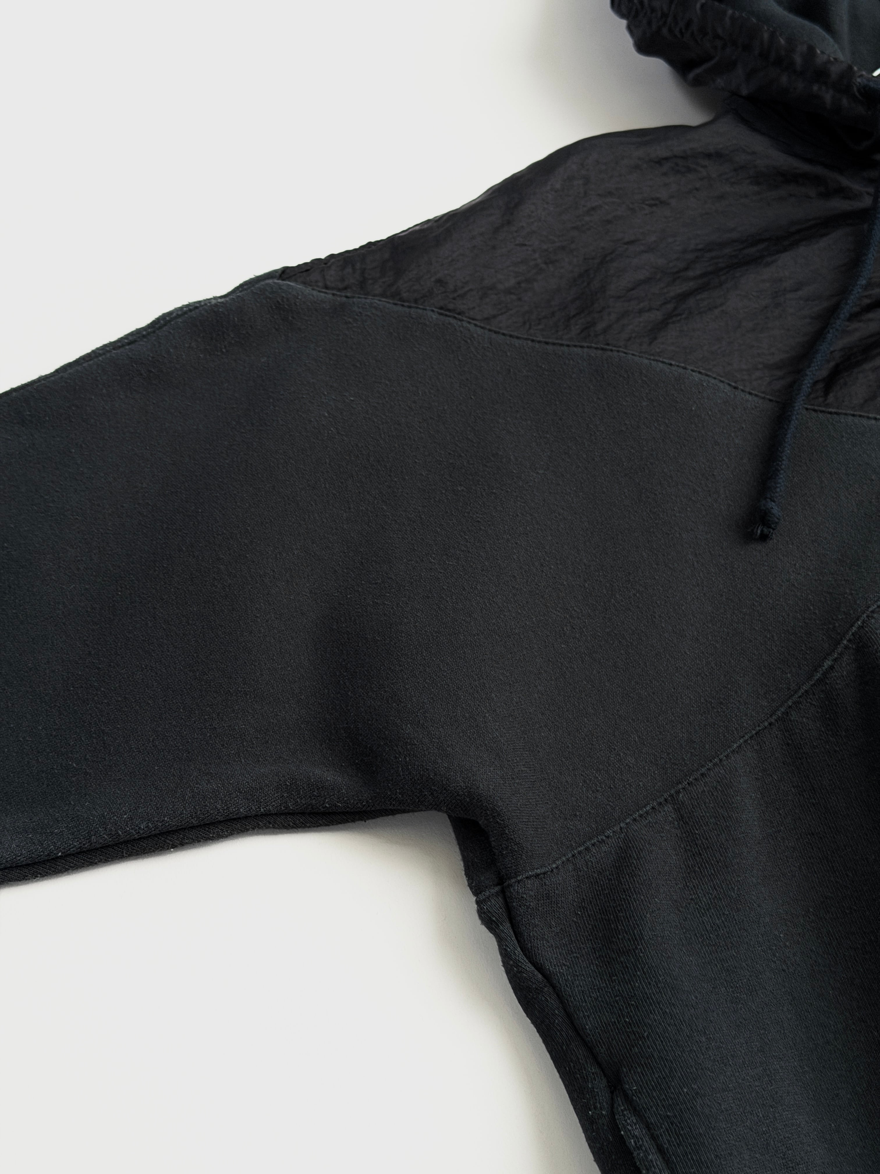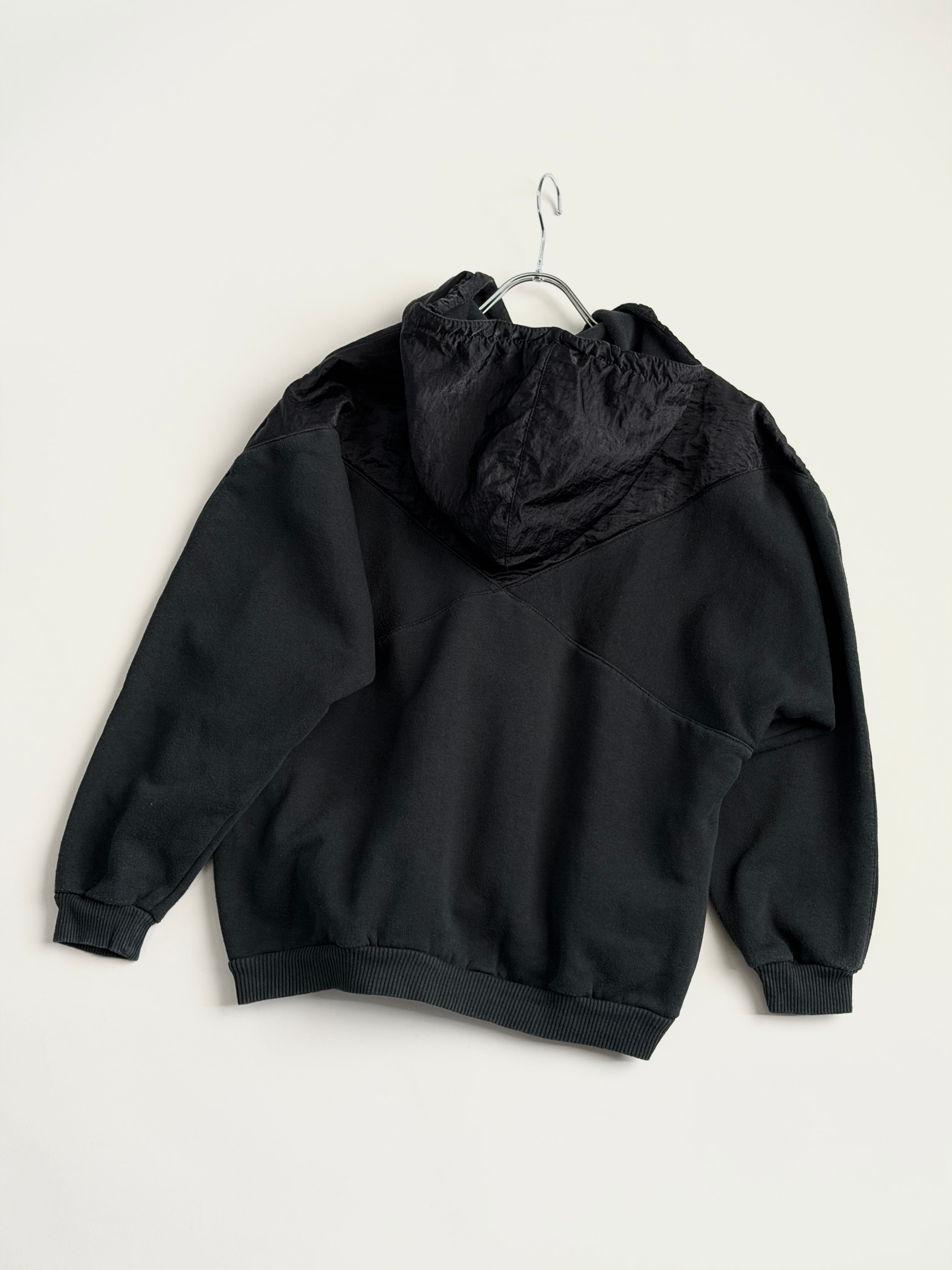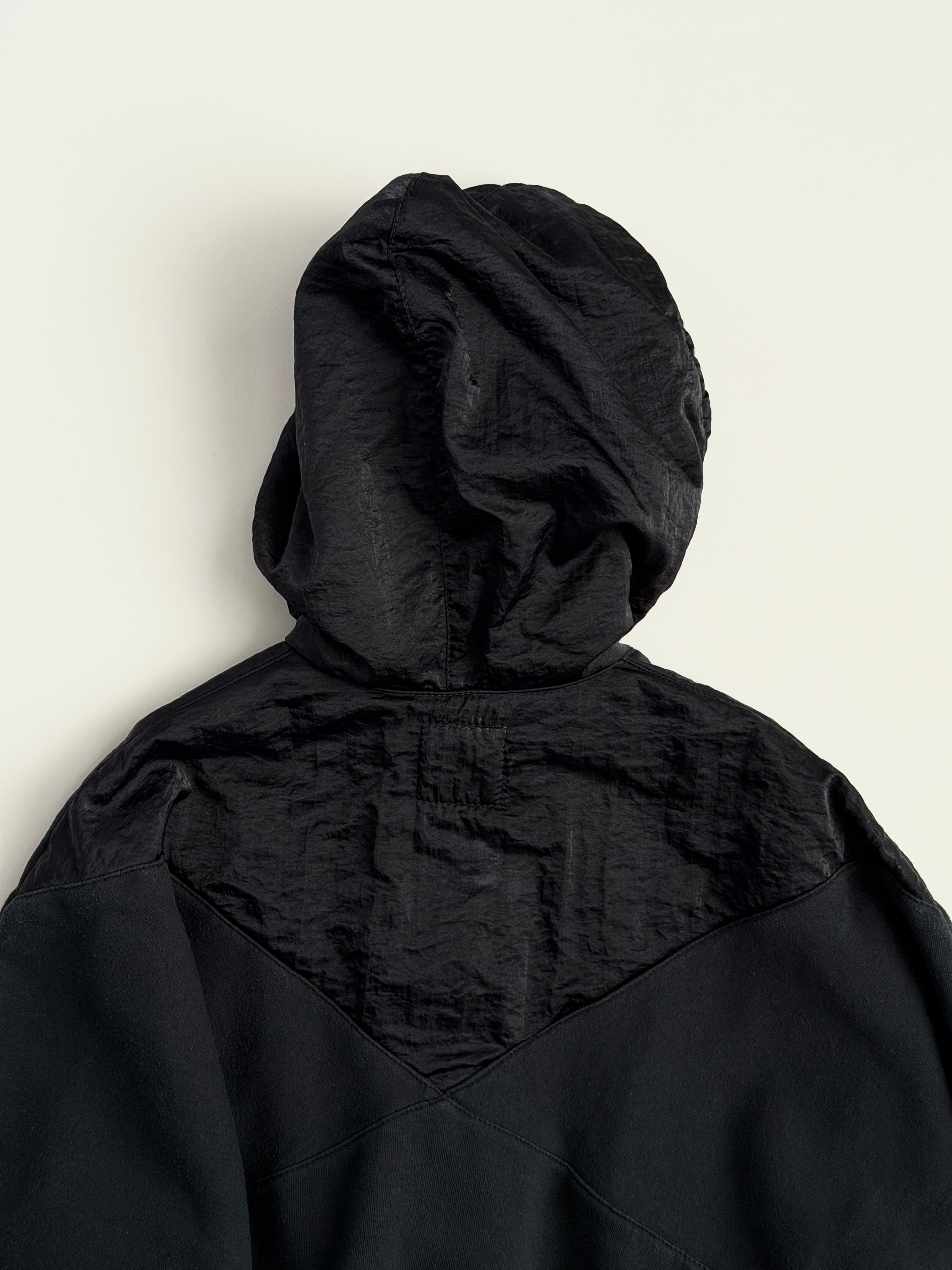 胸から上、フード部分はクシュっとしたナイロン系の生地に切り替わっています(内側はスウェット生地です)