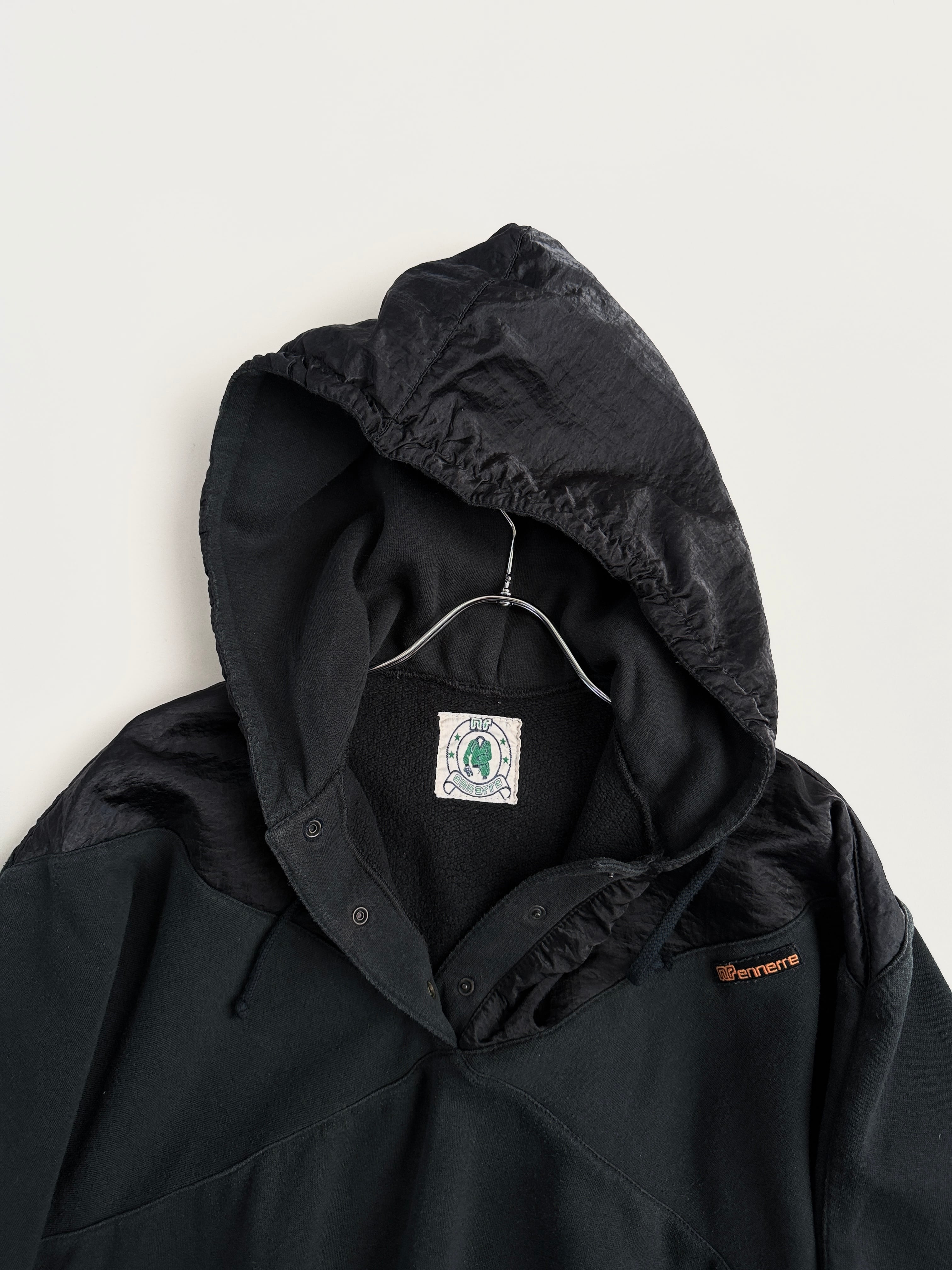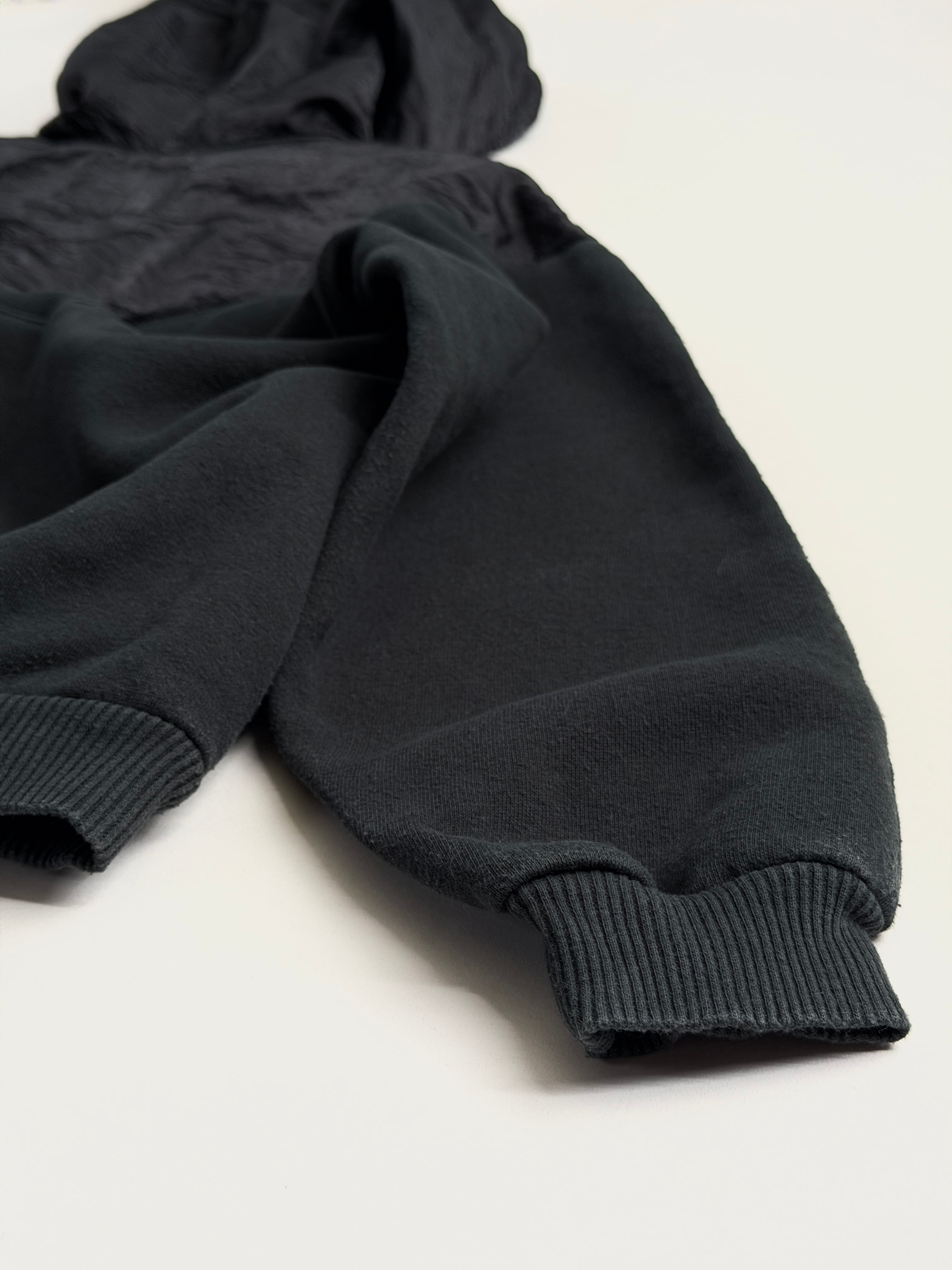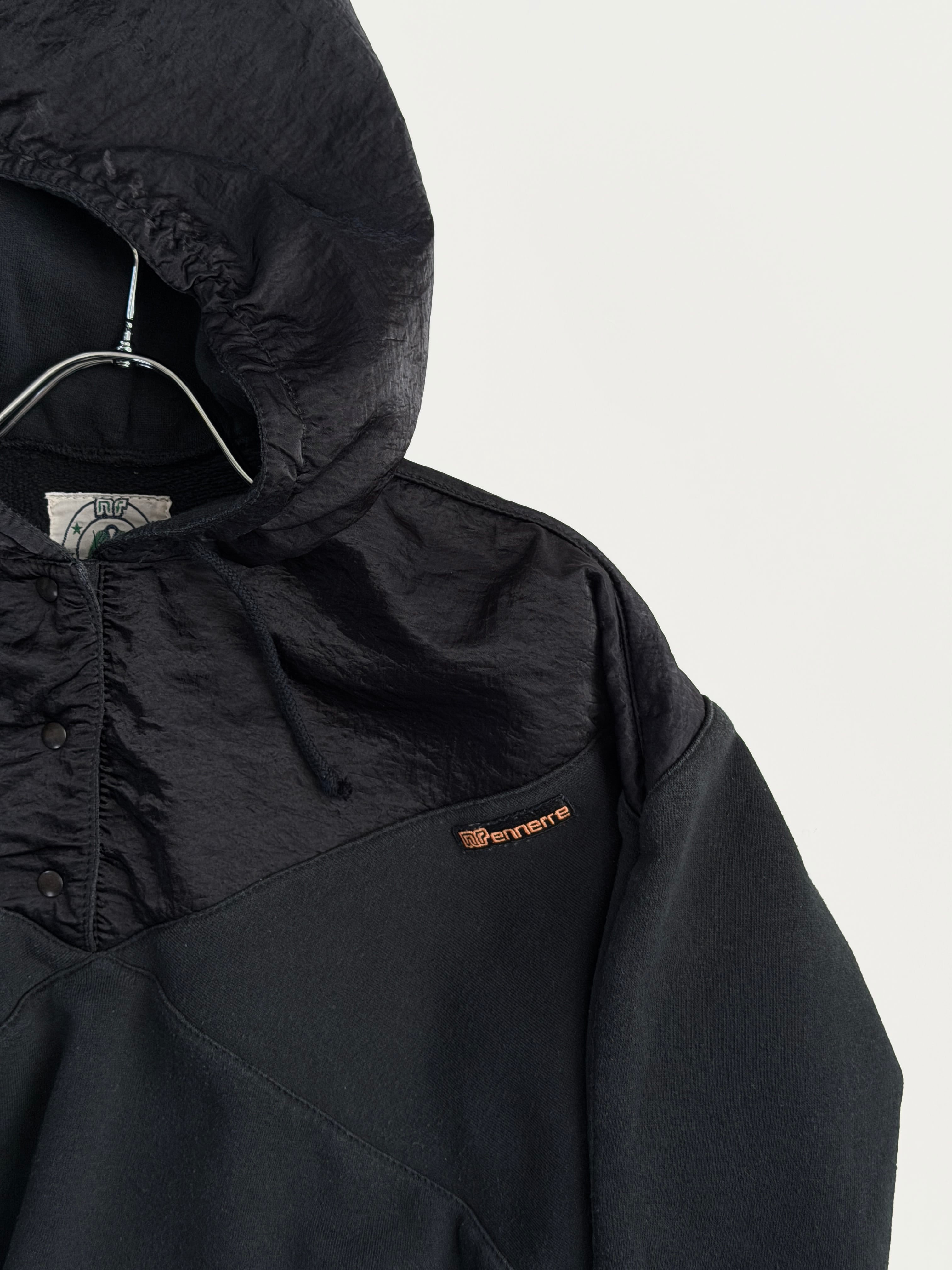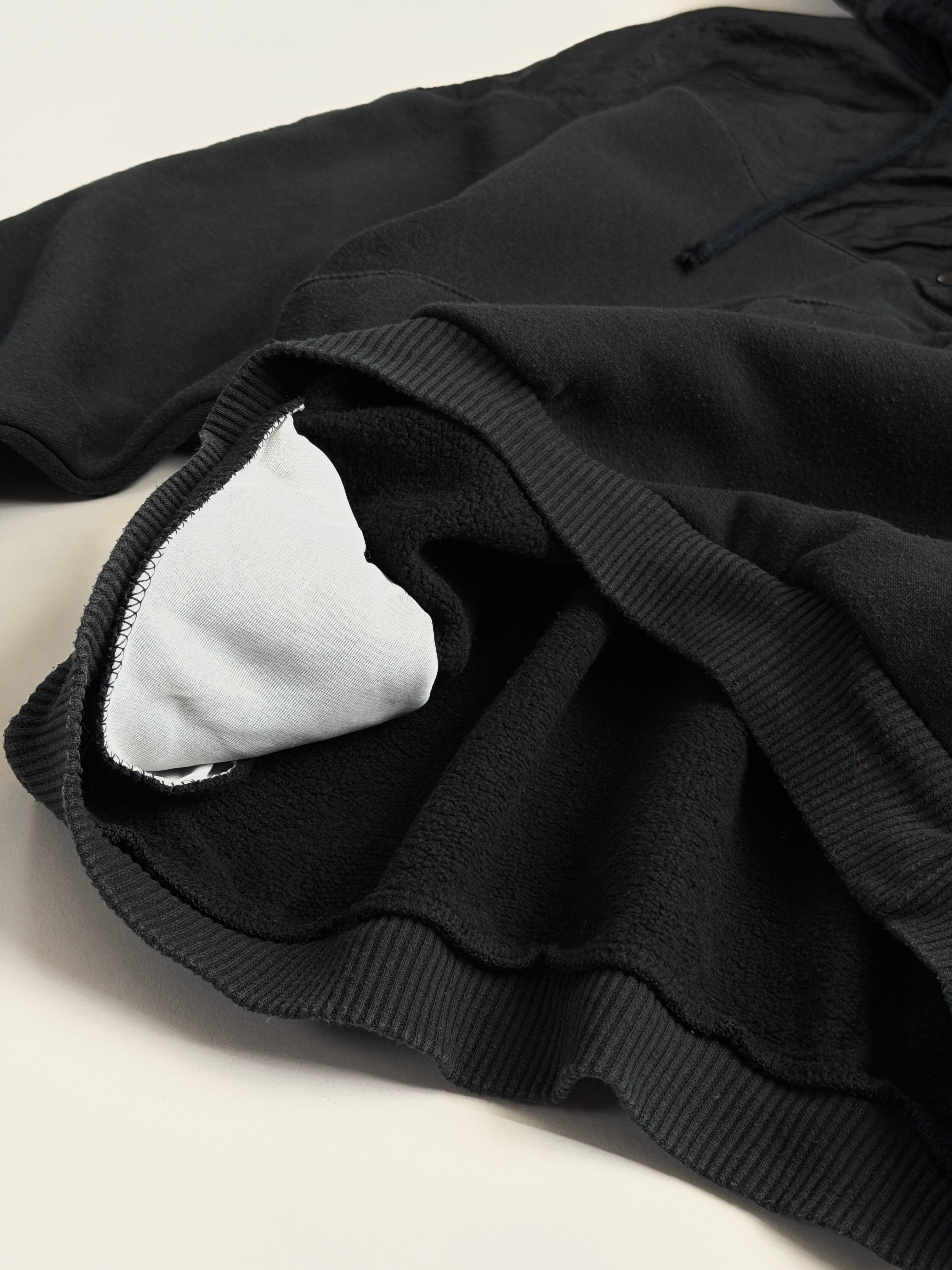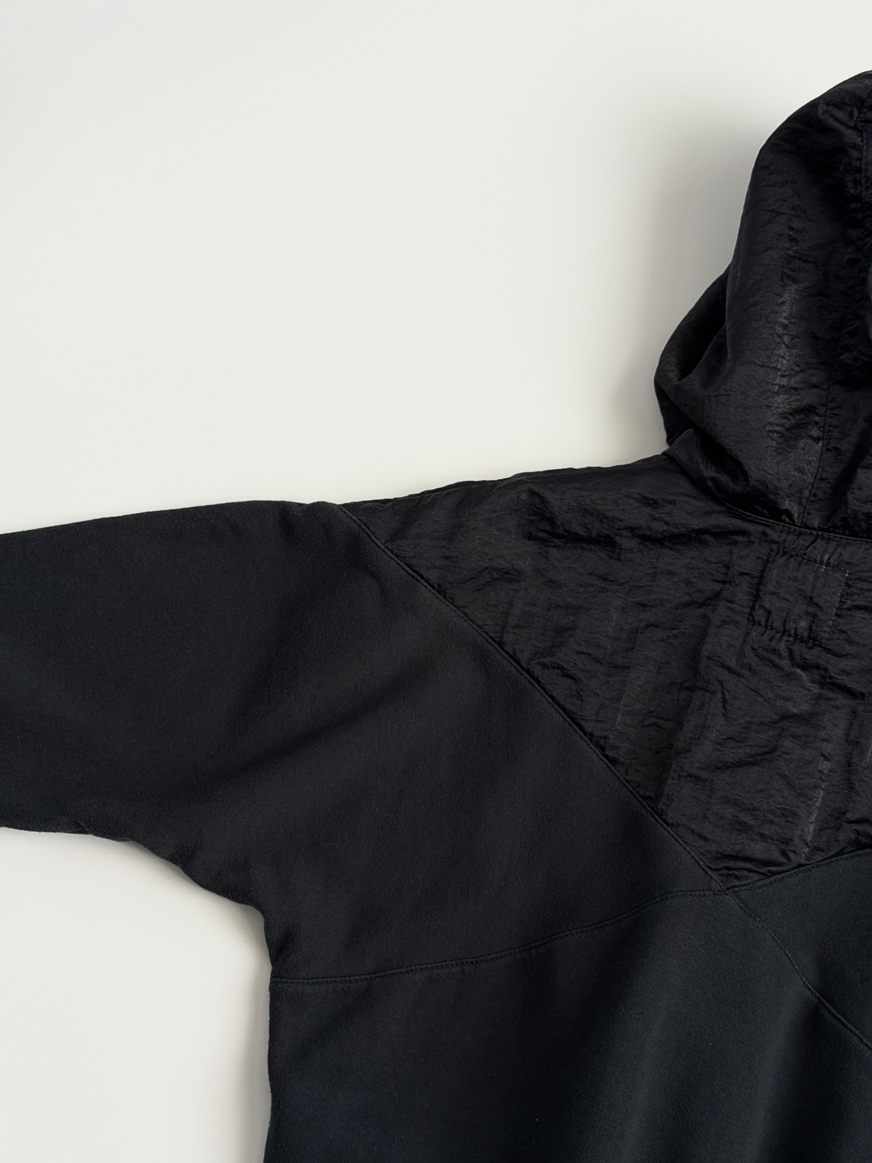胸から上、フード部分はクシュっとしたナイロン系の生地に切り替わっています(内側はスウェット生地です)