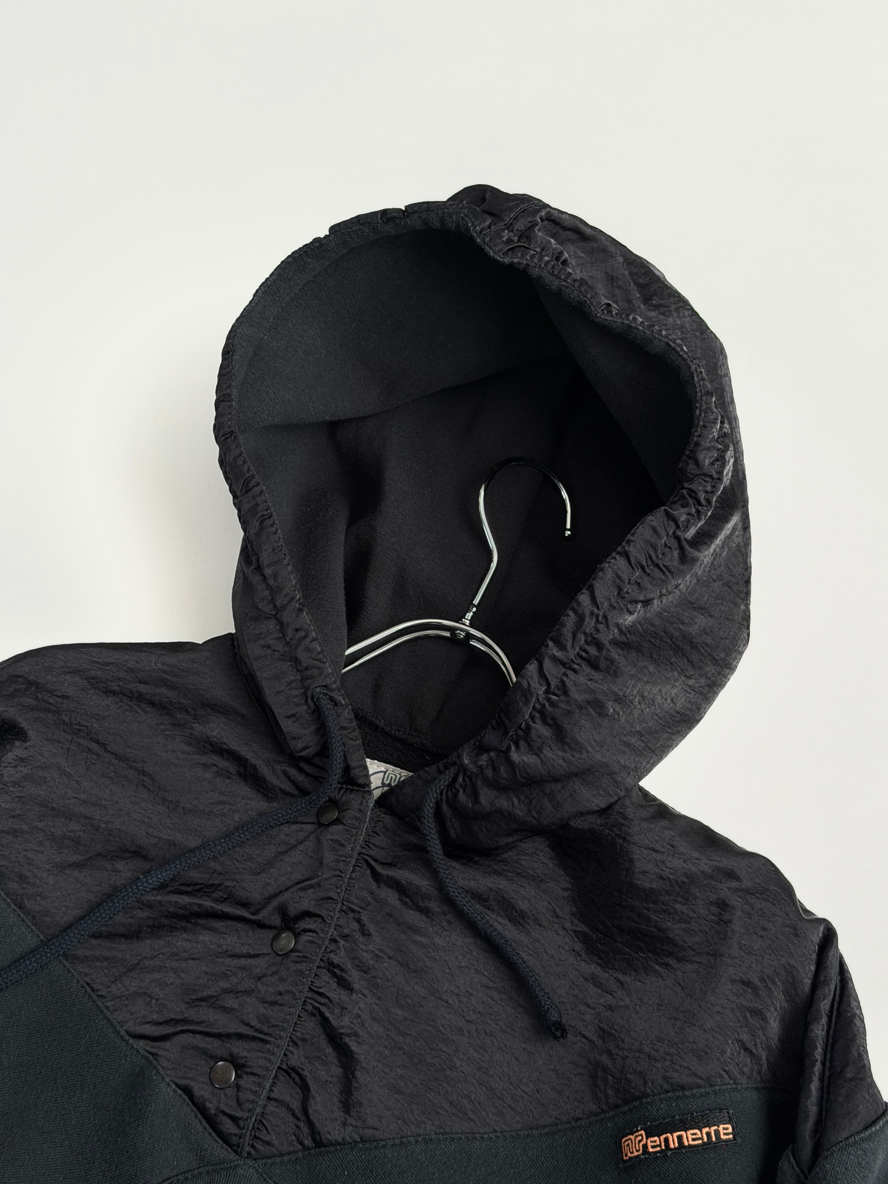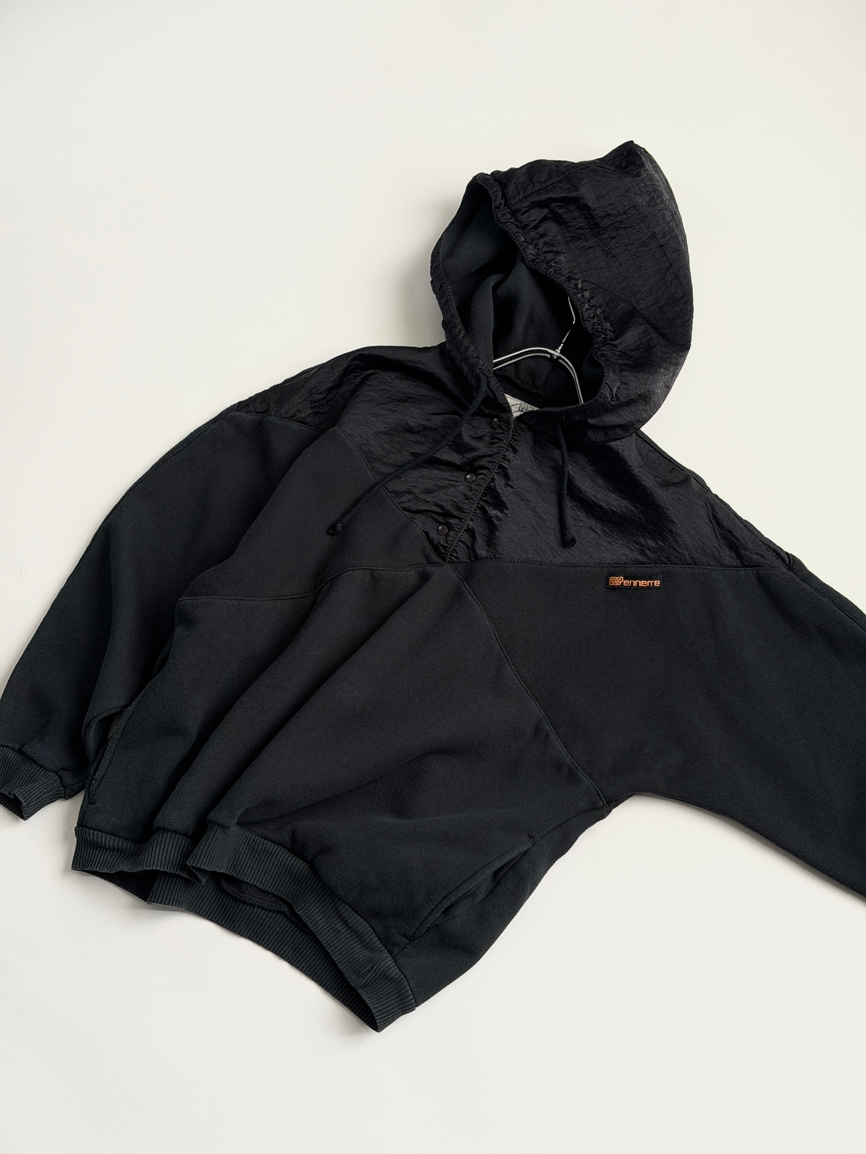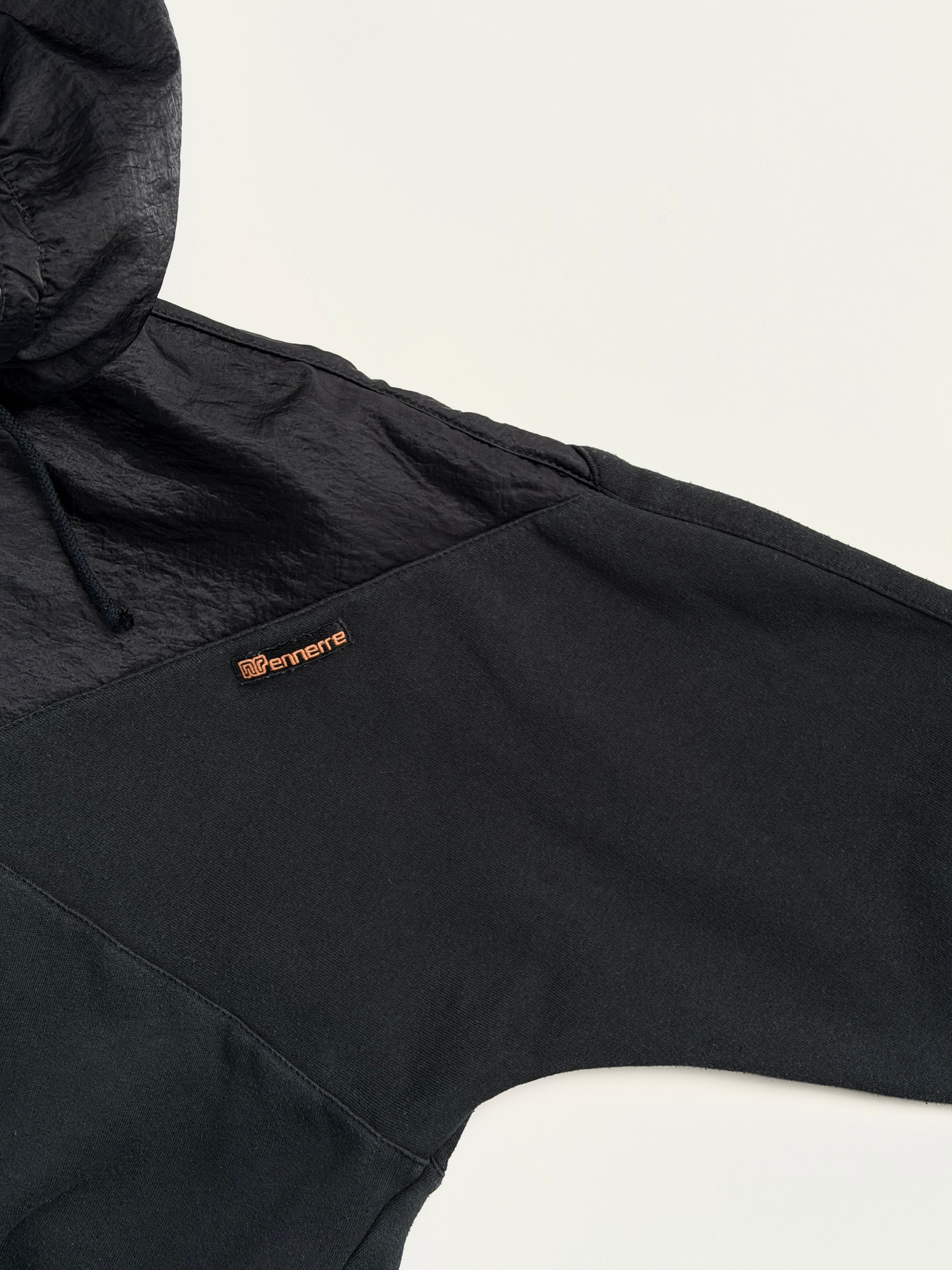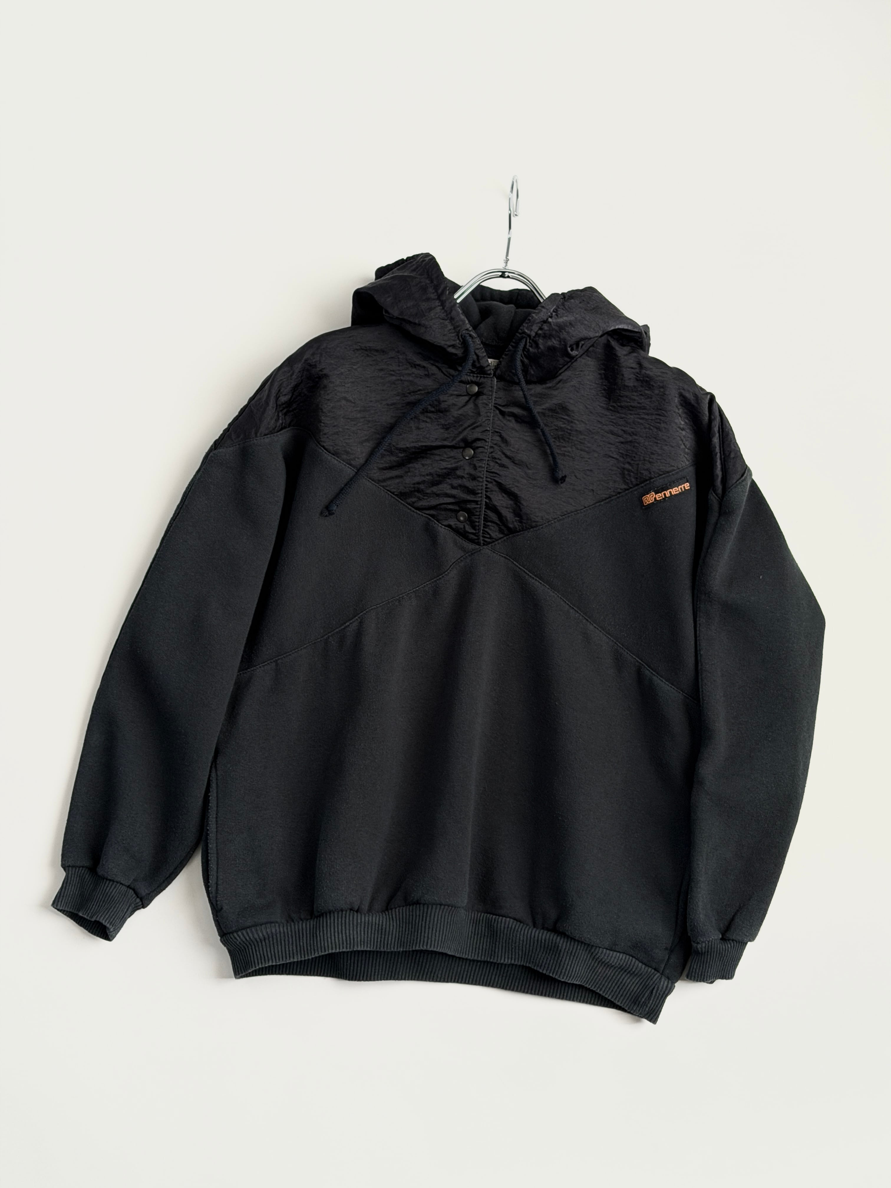胸から上、フード部分はクシュっとしたナイロン系の生地に切り替わっています(内側はスウェット生地です)