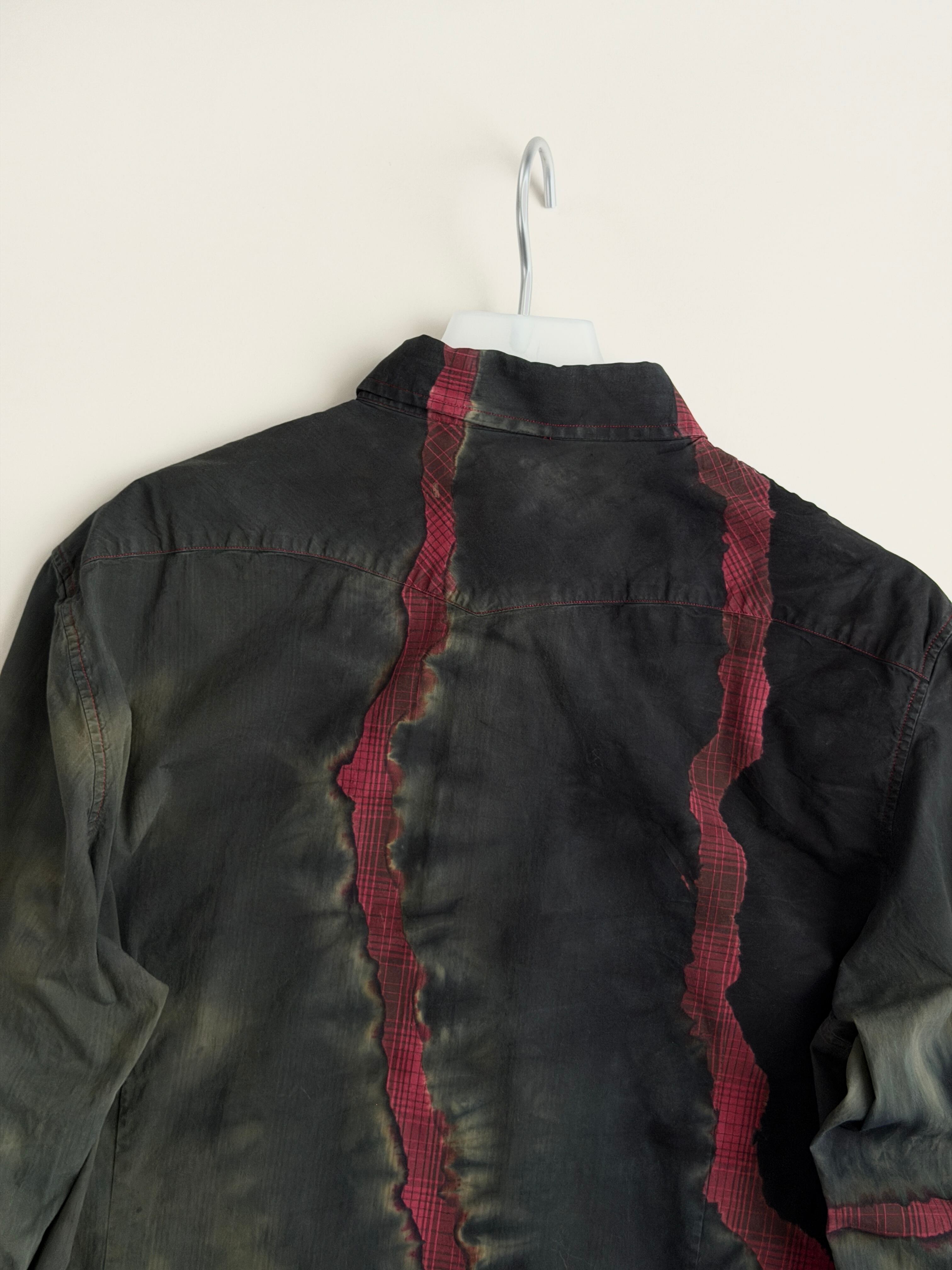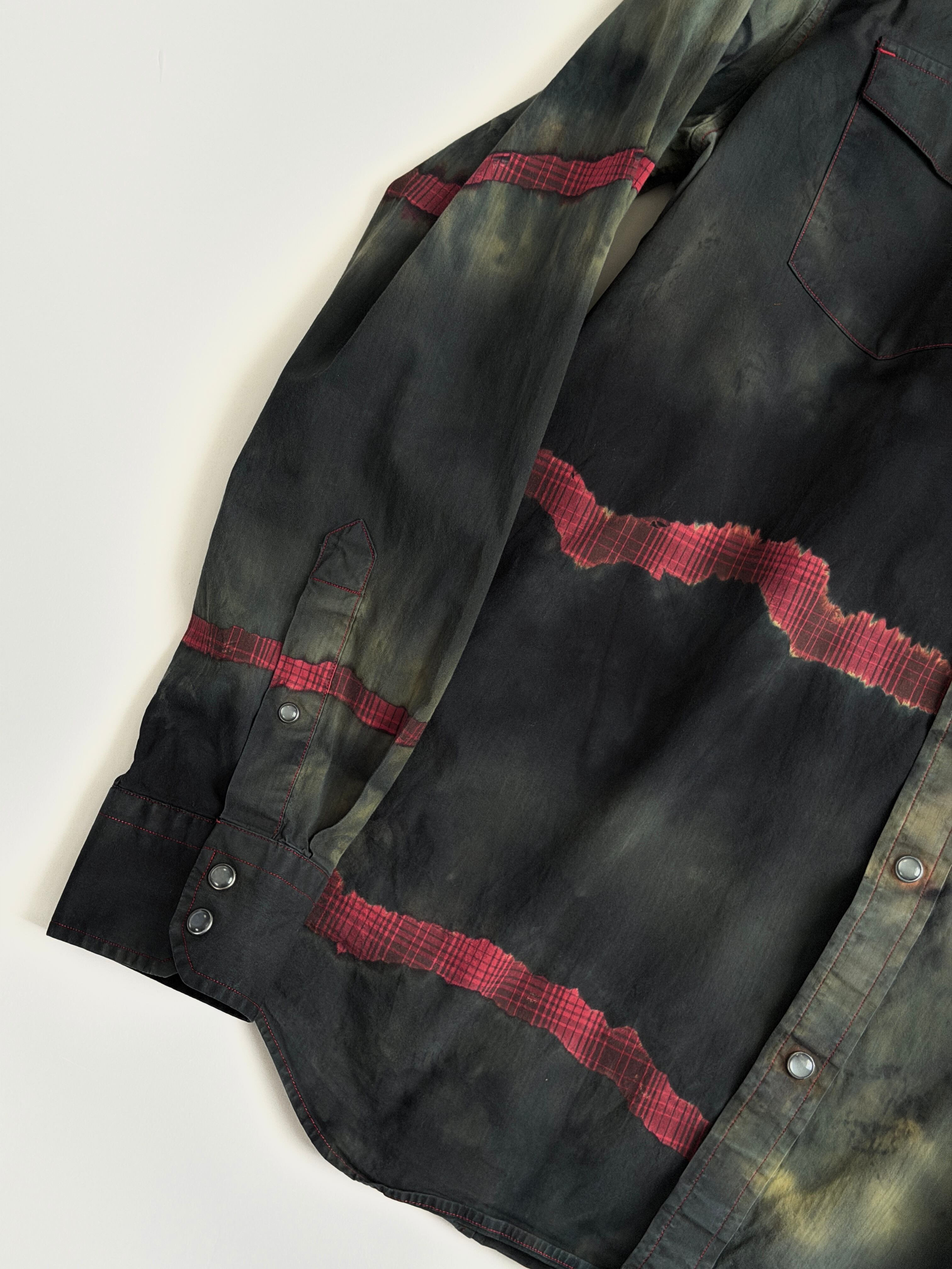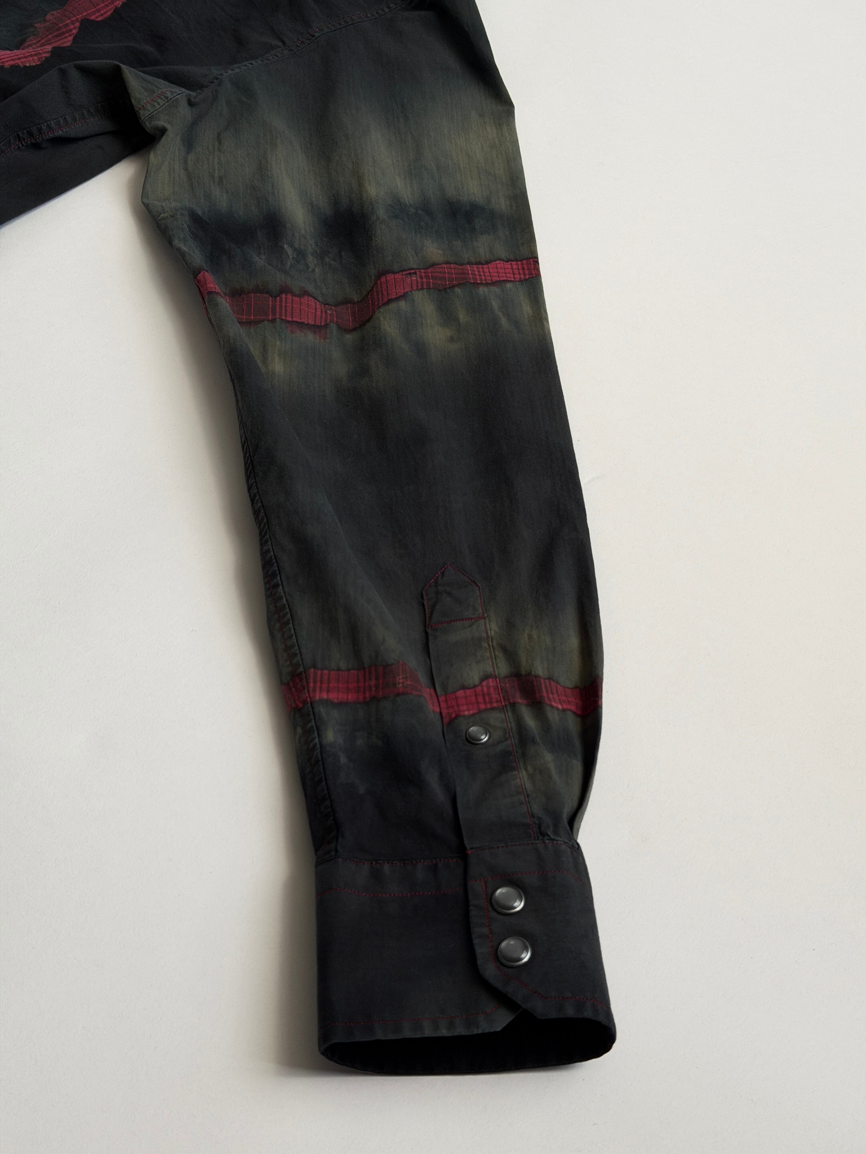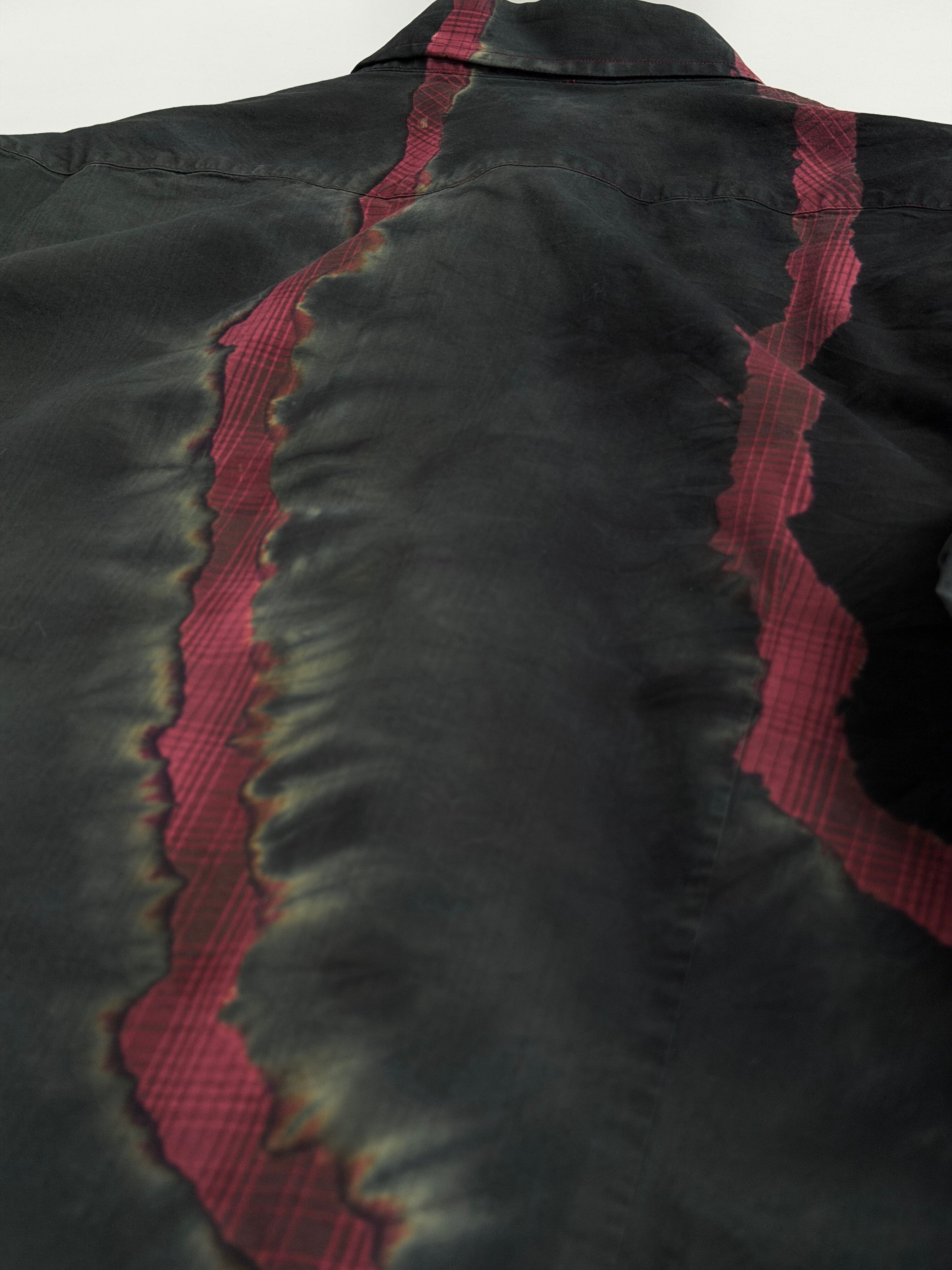 黒と深緑とオリーブのタイダイ色に赤いチェックの亀裂
