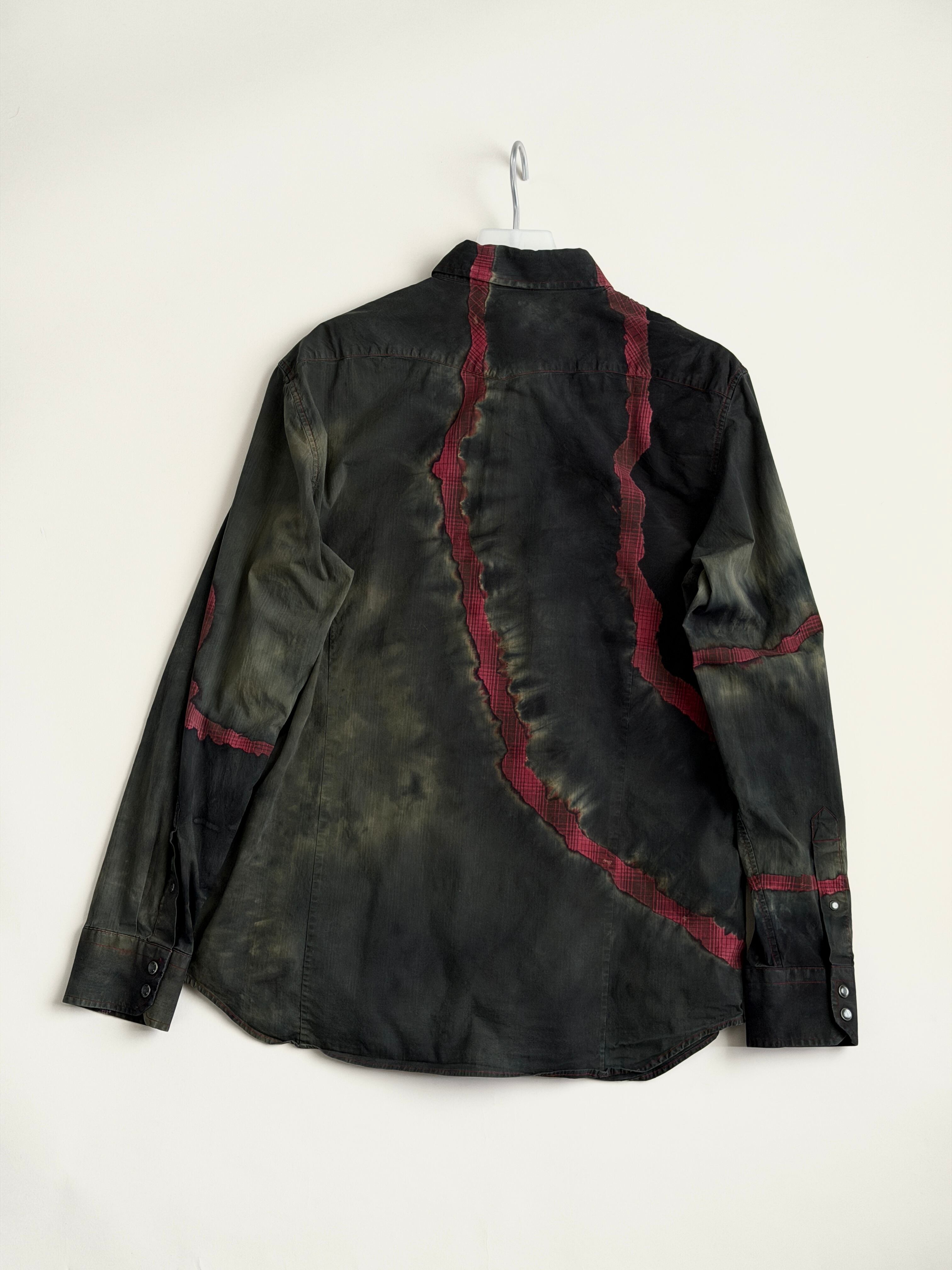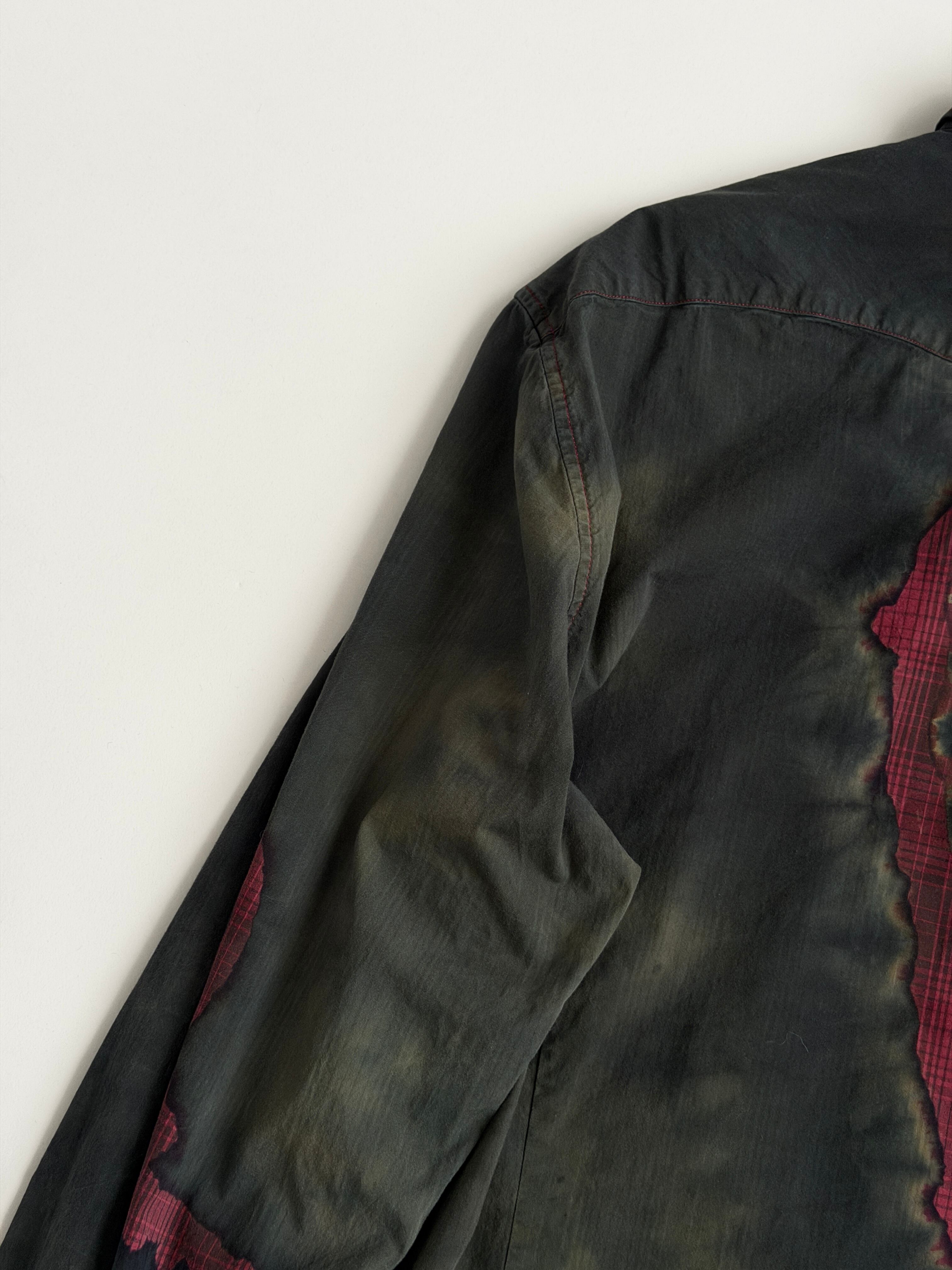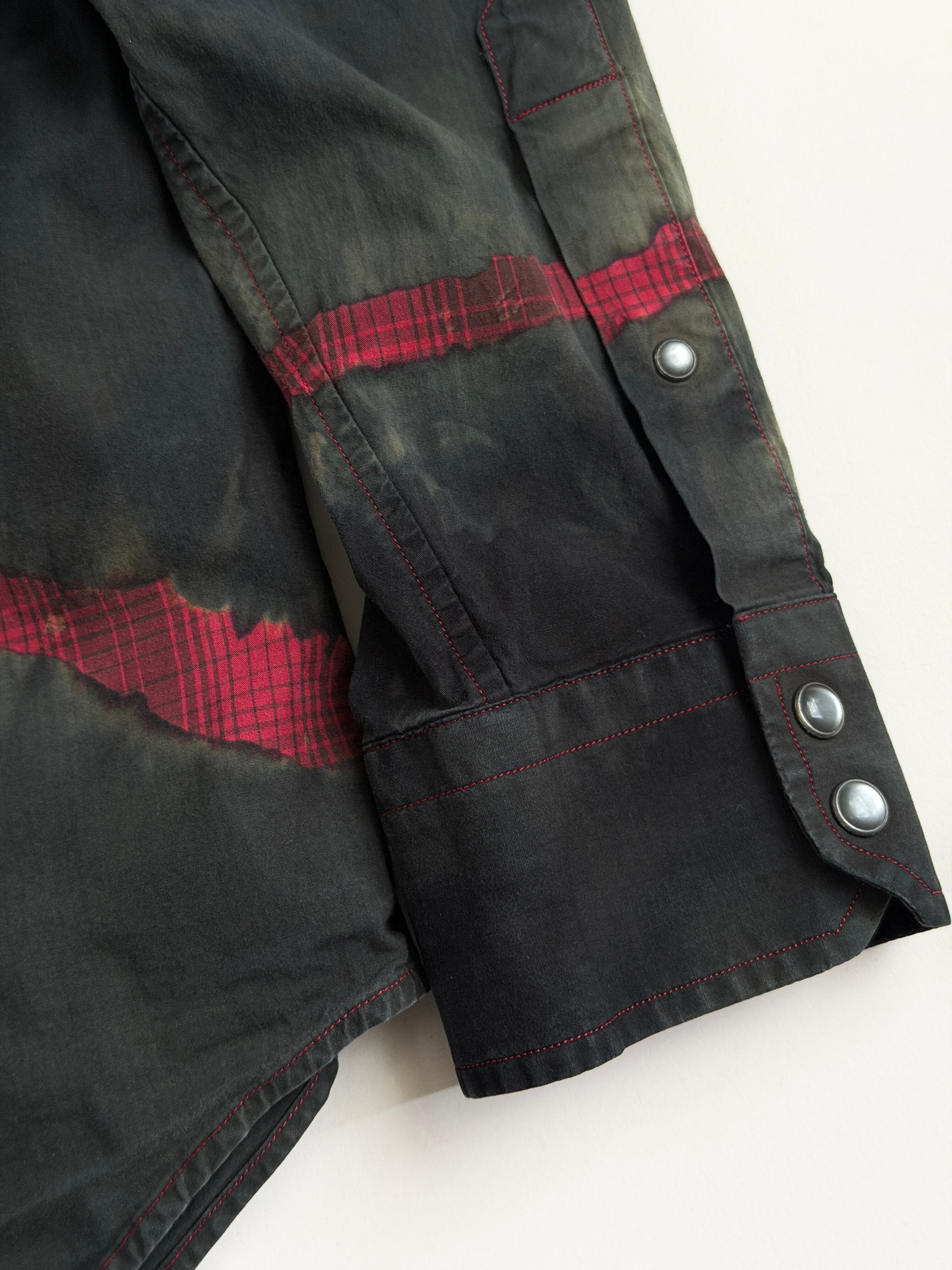 黒と深緑とオリーブのタイダイ色に赤いチェックの亀裂