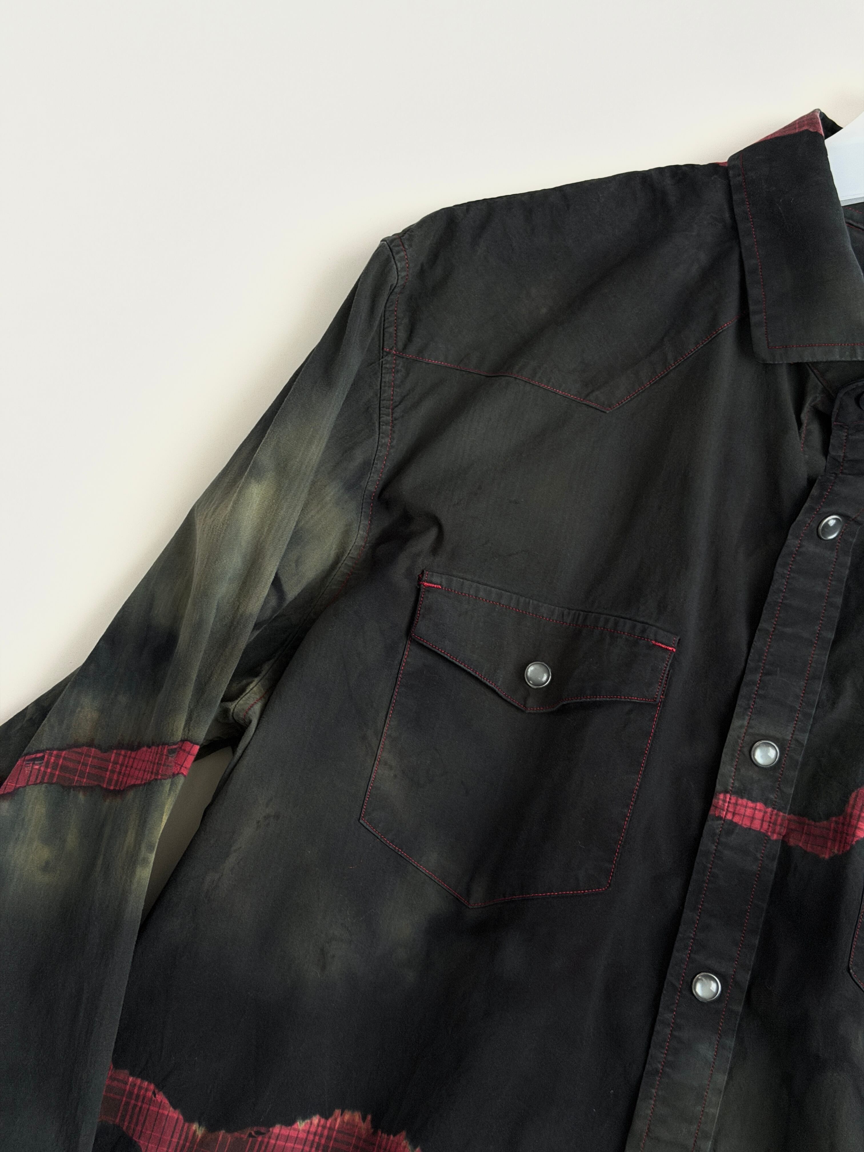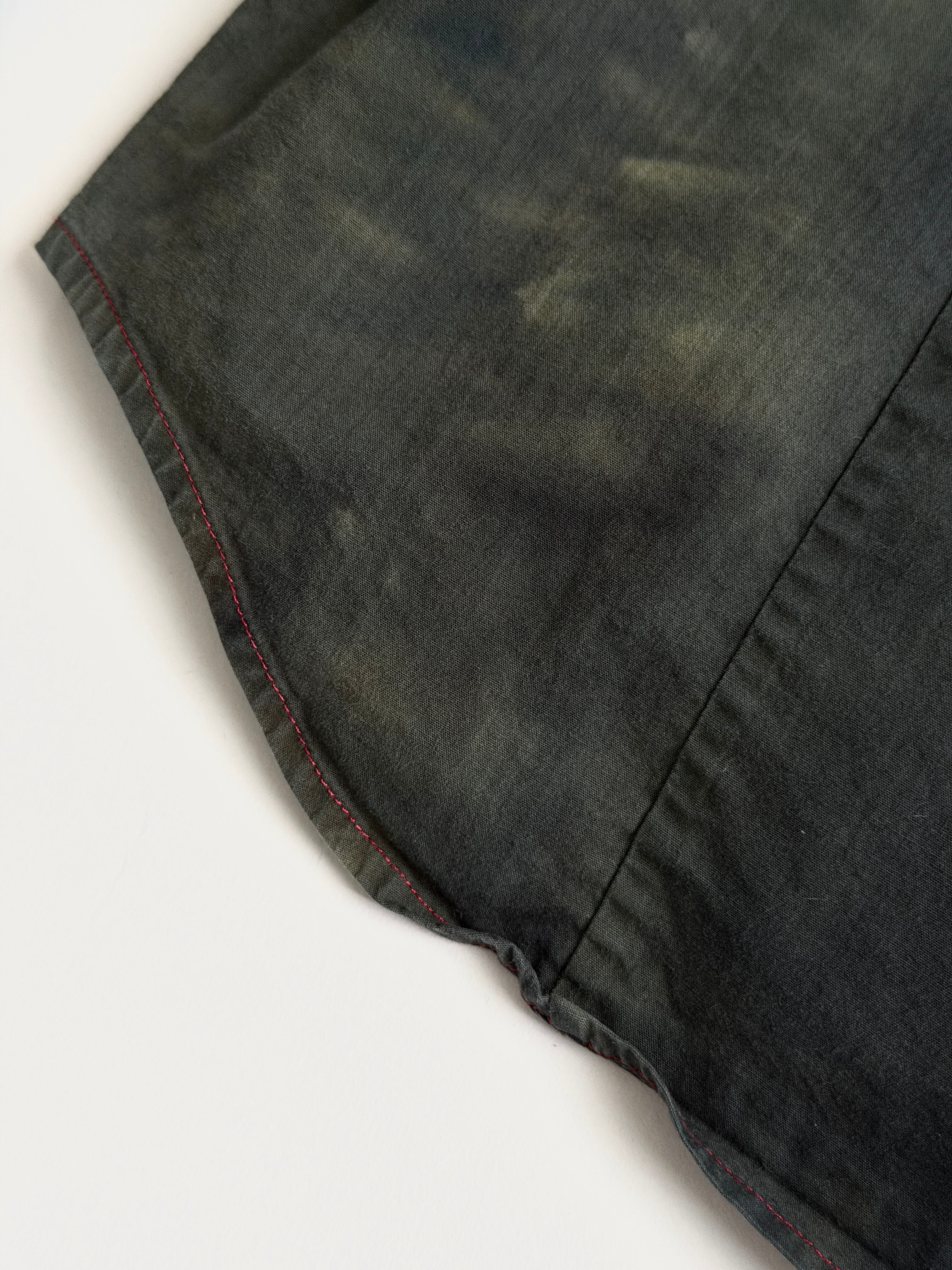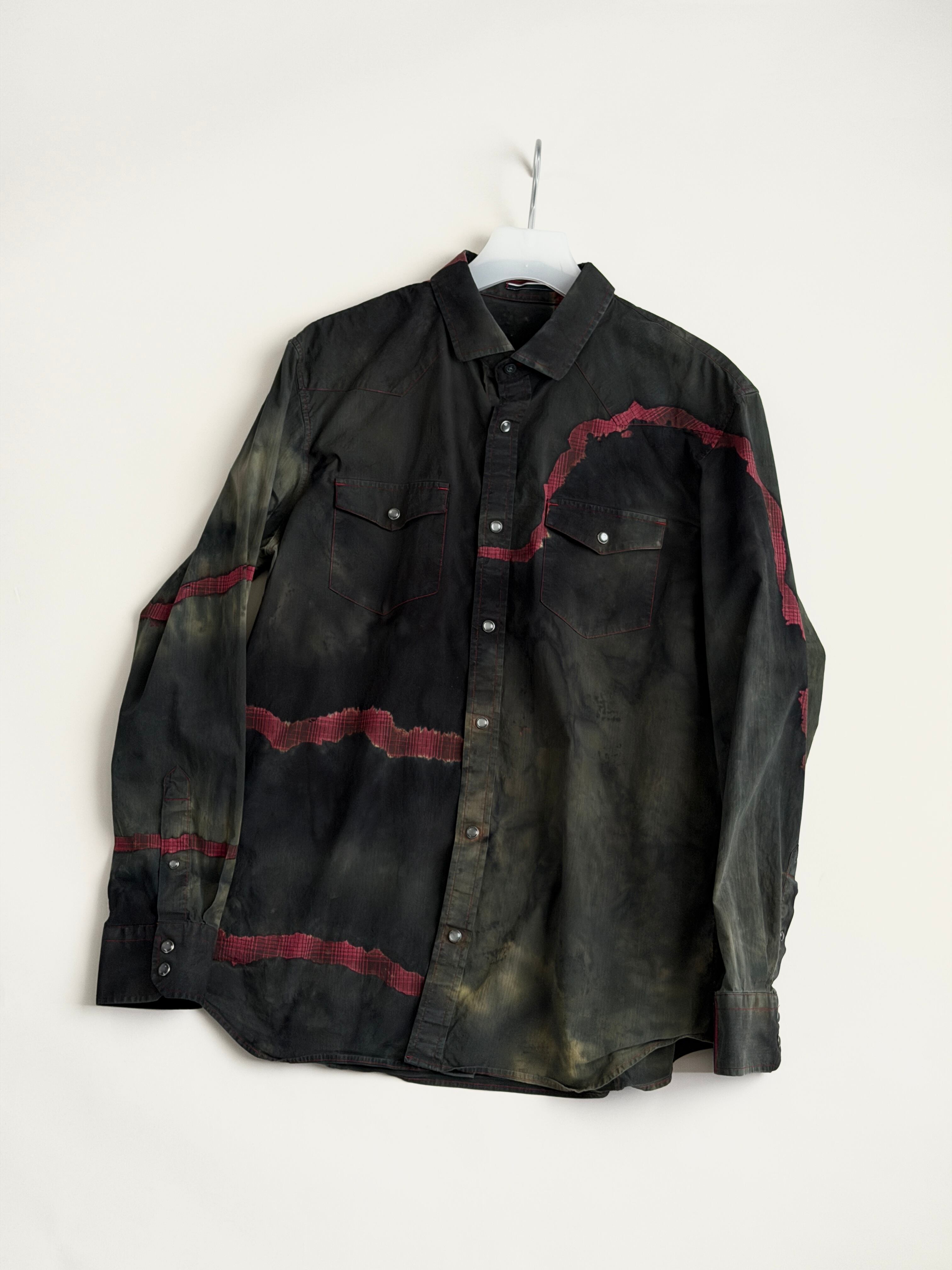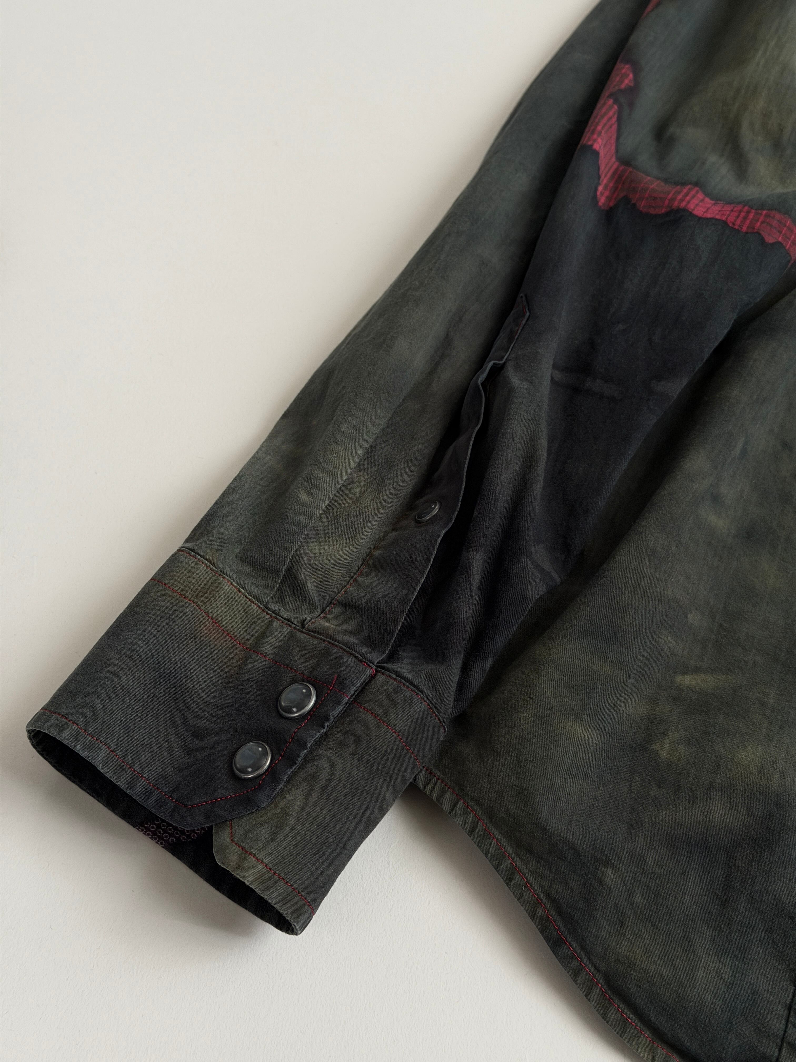 黒と深緑とオリーブのタイダイ色に赤いチェックの亀裂